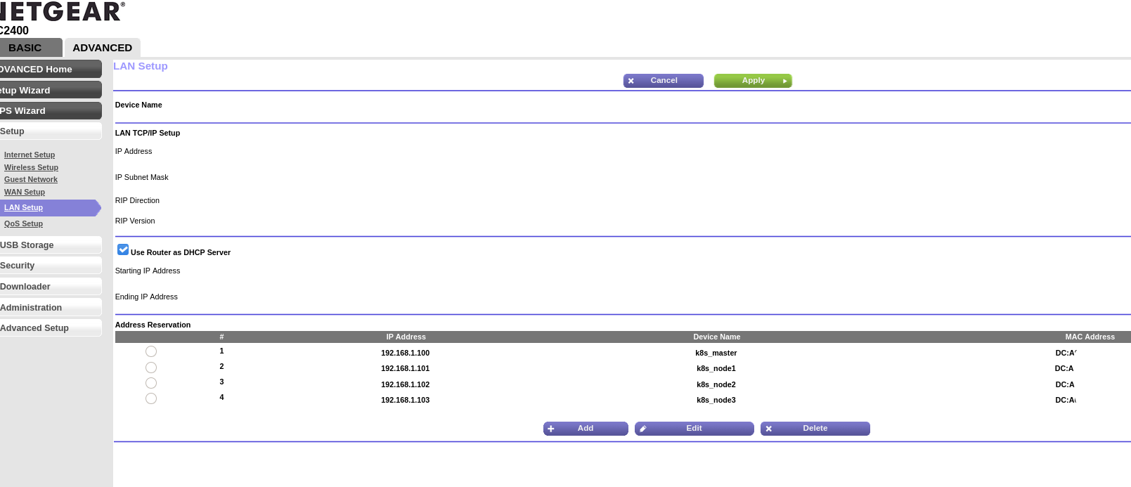 Next, I logged into the web interface for my router and created an address reservation entry for each Pi.