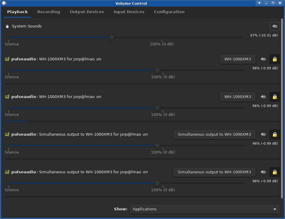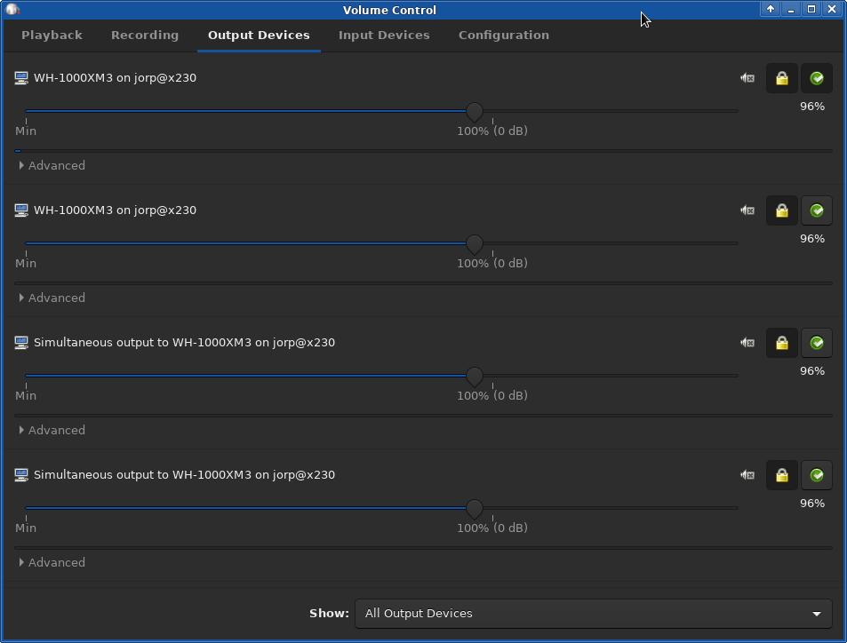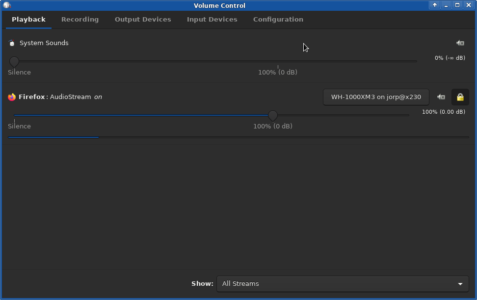 Check to make sure that your server’s configured audio device (WH-1000XM3) is listed as an output device on your client: